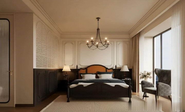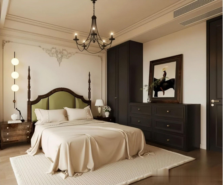 主卧室选了复古雕花床和柔粉色调,营造出完全放松的氛围。每晚拧亮床头那盏黄铜壁灯,光线温柔地洒下来,所有疲惫都瞬间消散。这里的每件家具、每个摆设,都是为了“让自己睡得更好”。