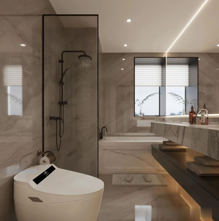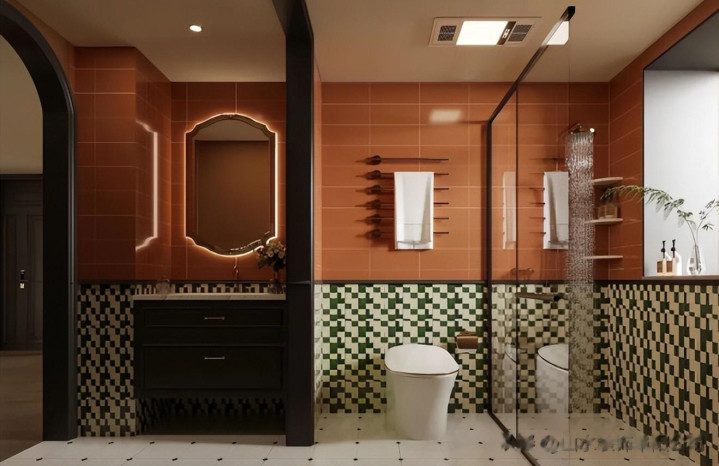 还有不得不提功能与美学的双赢的卫浴空间。客卫用复古红棕与绿白格纹砖打造出电影感,金属配件点缀得恰到好处。主卫则是高级灰大理石配嵌入式浴缸,忙碌一天后泡个热水澡,是给自己最好的犒劳。