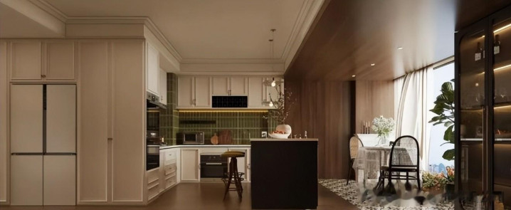 餐厅连着开放式厨房,业主最满意的是那张实木长桌。周末朋友来时,这里能摆满美食与笑声。平日里可以作为家庭工作区。一旁的餐边柜里收藏着他们从各地带回的杯碟,成为三餐之外的浪漫角落。