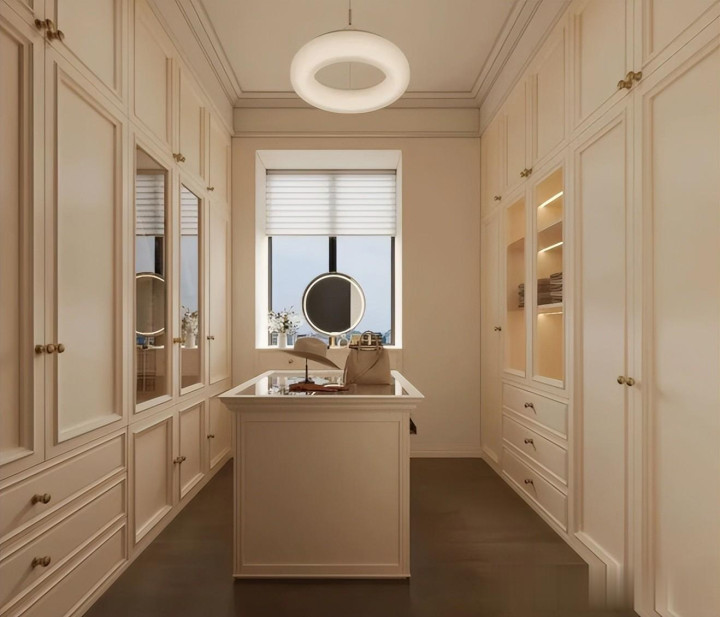 衣帽间是理智与情感的结合。奶油白定制柜收纳力超强,中间玻璃岛台专门存放首饰、丝巾。每天早上站在这里,阳光透过百叶窗洒进来,挑选穿搭不再是任务,而是充满仪式感的享受。